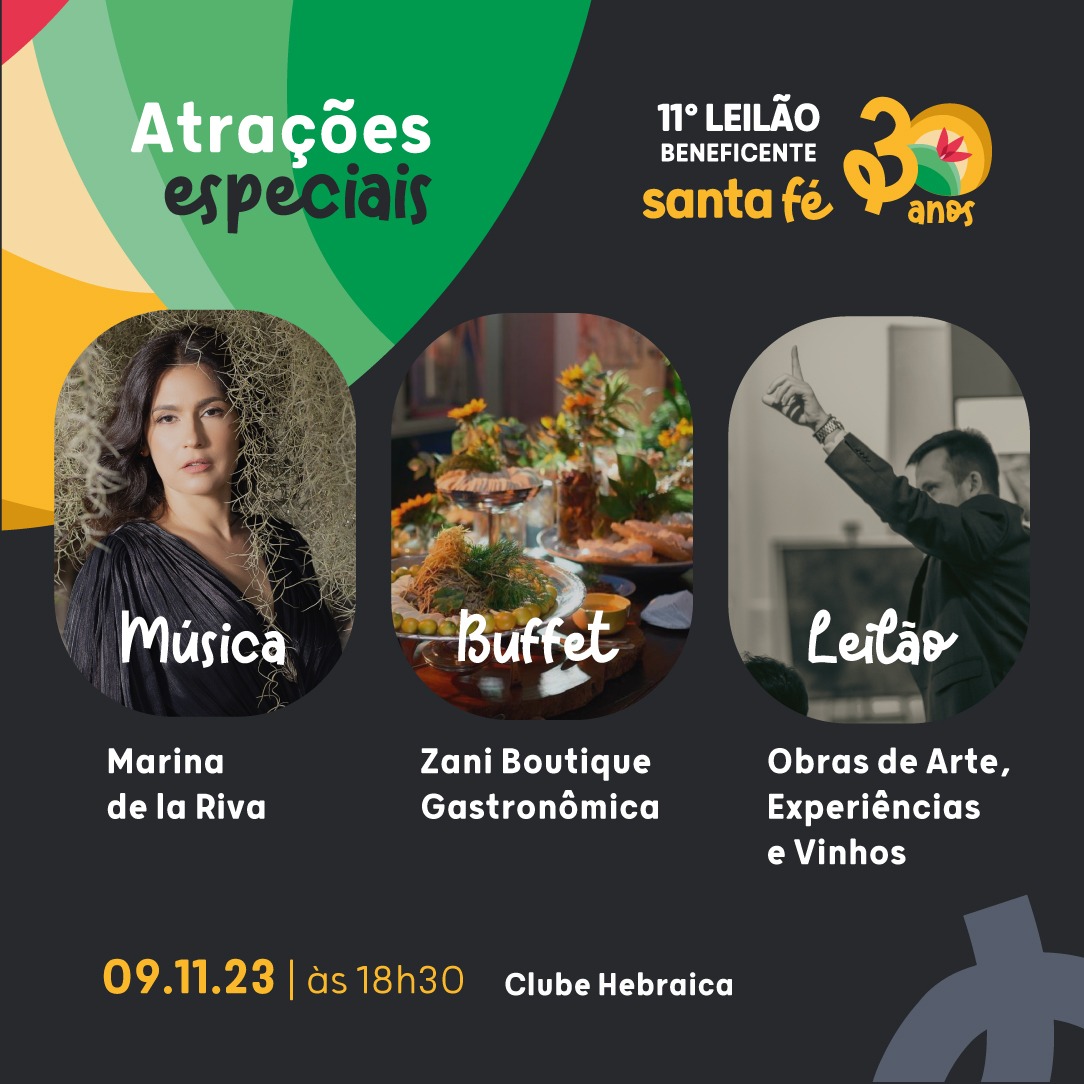 O nosso evento anual está chegando. E, esse ano, vai ser ainda mais especial porque estamos celebrando os 30 anos da Associação Beneficente Santa Fé. O evento contará com o show incrível de Marina de la Riva, o cardápio exclusivo da Zani Boutique Gastronômica e o tradicional Leilão de Obras de Arte, Experiências e Vinhos!